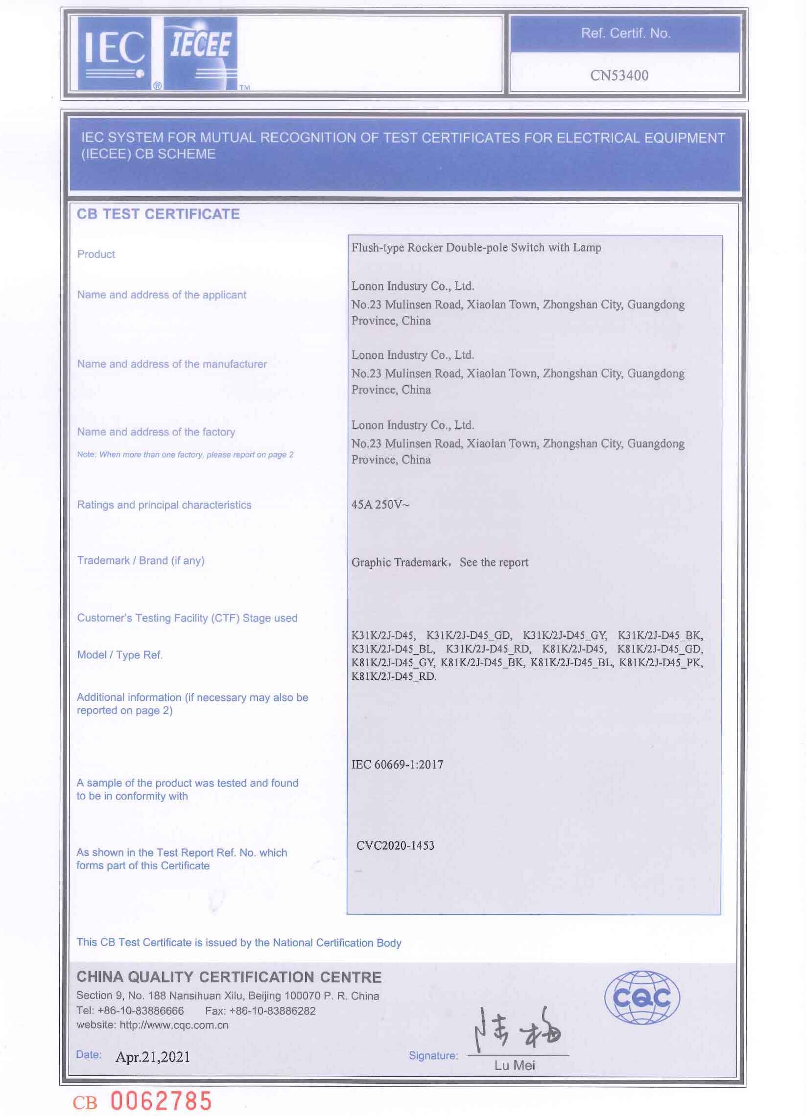 CN53400 K3K8_45A CB Test CERTIFICATE